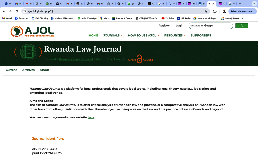 The Rwanda Law Journal has recently achieved a significant milestone by being indexed by African Journals Online (AJOL), the largest and preeminent platform for African-published scholarly journals. This achievement underscores the quality and impact of the Rwanda Law Journal, enhancing its accessibility and visibility to a global audience of researchers, academics, and legal professionals.
